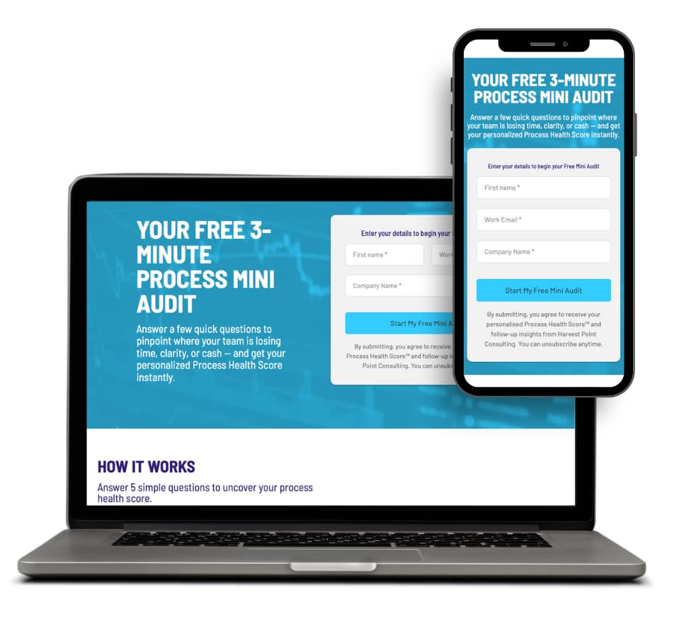 Answer a few quick questions to pinpoint where your team is losing time, clarity, or cash — and get your personalized Process Health Score instantly.
